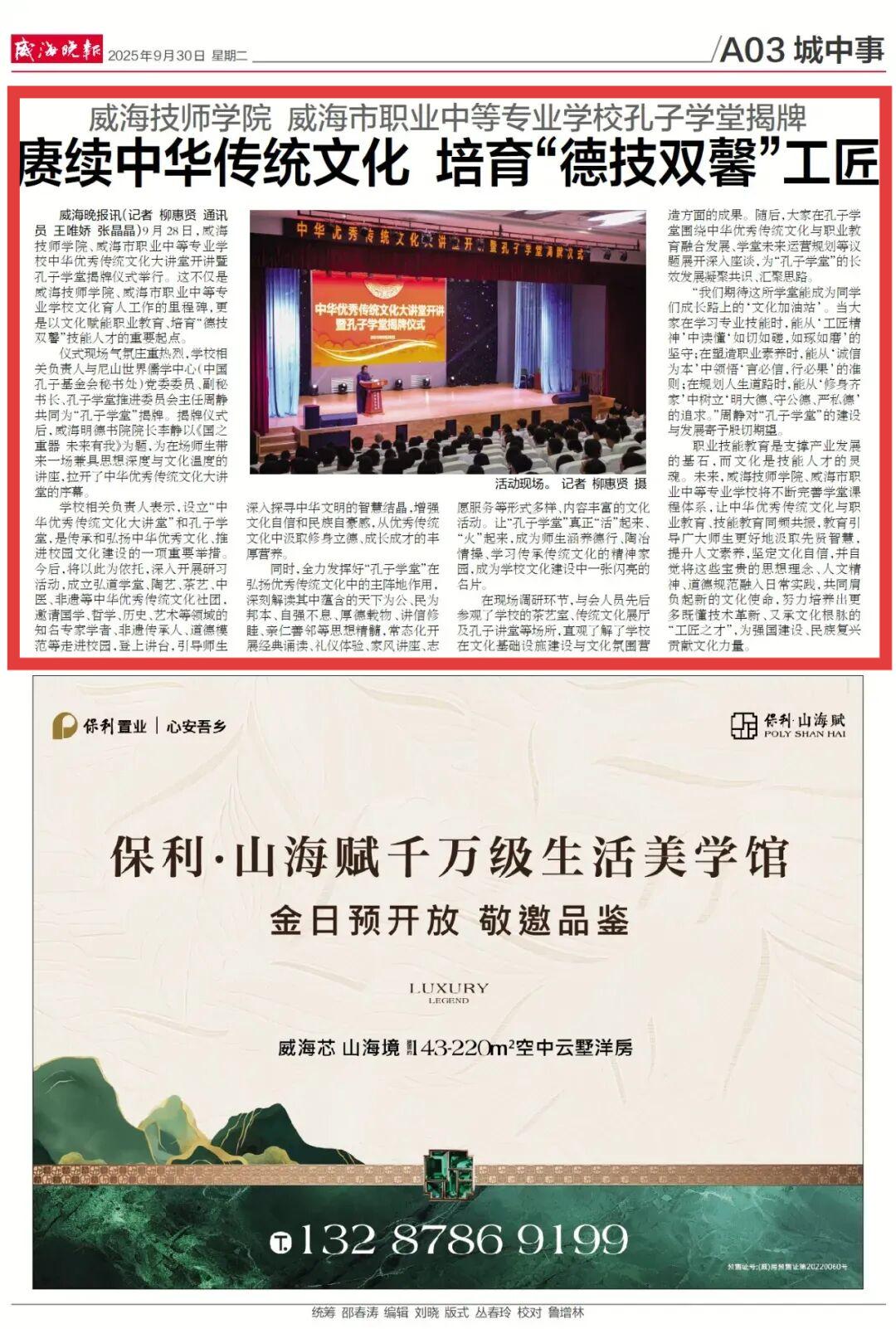 【威海晚报】赓续中华传统文化 培育“德技双馨”工匠