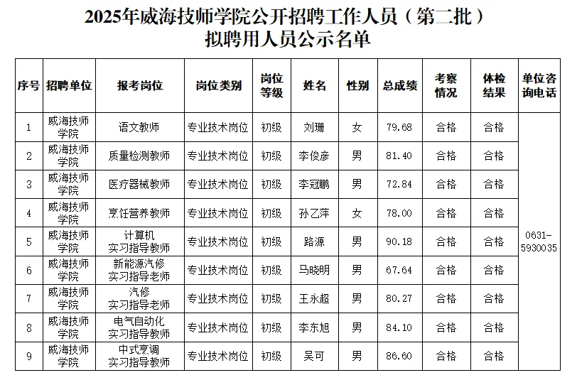 关于2025年威海技师学院公开招聘工作人员(第二批)拟聘用人员名单的公示