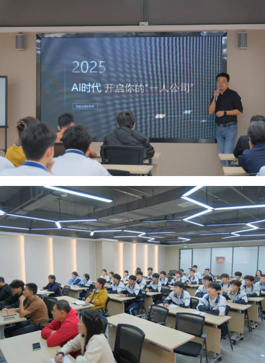 随后师生参加了《AI 时代 —— 开启你的 “一人公司”》主题培训,主讲老师围绕 AI 智能体的核心逻辑与实操方法深度拆解,讲解 AI 辅助创意构思、批量设计优化,帮助学生突破传统设计瓶颈,掌握符合行业需求的高效创作能力,引导学生将所学技能与 AI 技术结合,提升工作效率,拓展就业路径。